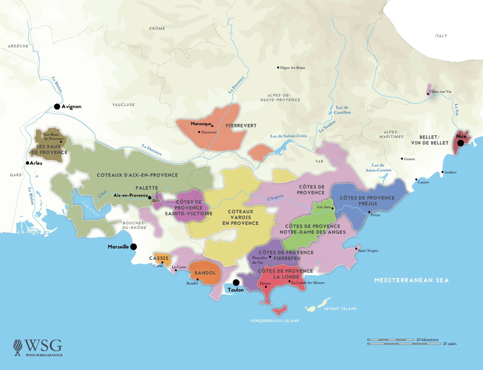 This map presents the distinguished wine regions of Provence, a testament to the rich viticultural heritage of southeastern France. It intricately details the geographical boundaries and appellations of this storied wine-producing area, from the sun-drenched coast of the Mediterranean Sea to the alpine foothills. Key cities and towns are marked alongside the various wine appellations, providing an invaluable resource for understanding the terroir and provenance of Provençal wines. This map is an essential companion for the acclaimed French Wine Scholar® program, offering students a visual guide to the complexities of French wine geography.