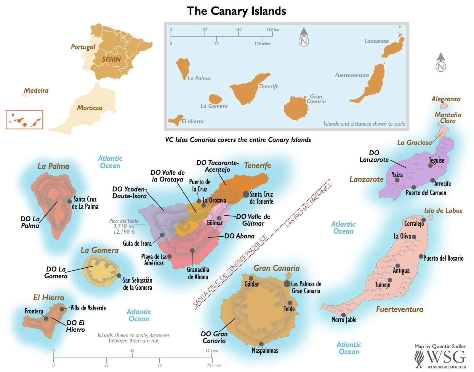 This map presents a detailed view of the Canary Islands, an archipelago off the northwest coast of Africa, highlighting its varied wine regions designated by their respective Denominación de Origen (DO). From the volcanic landscapes of Lanzarote to the ancient laurel forests of La Gomera, each region offers a unique terroir, reflected in the distinct wines produced. Notably, the map is scaled to represent the islands accurately in relation to each other, although the distances between them are not to scale. This map has been specifically designed to complement the Spanish Wine Scholar® program, a comprehensive study resource for industry professionals and wine enthusiasts alike.