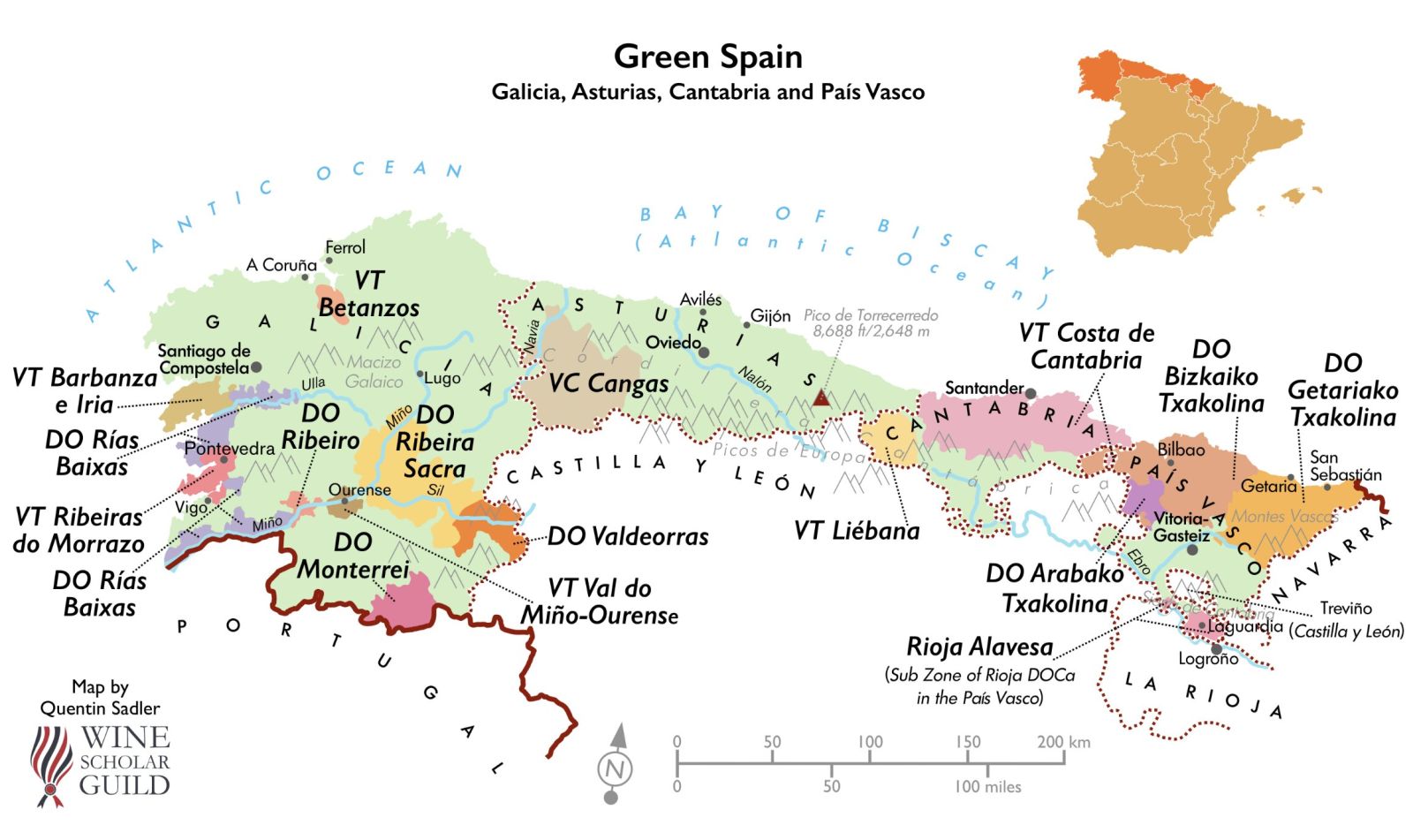 This map provides a detailed overview of Green Spain's prominent wine regions, covering Galicia, Asturias, Cantabria, and País Vasco. It meticulously delineates the diverse Denominaciones de Origen (DO) and Vinos de Calidad con Indicación Geográfica (VC), highlighting the unique viticultural areas from the cool, verdant northwestern corner of Spain. The map has been designed to complement the educational content of the Spanish Wine Scholar® program, the industry's most respected certification on the wines of Spain.